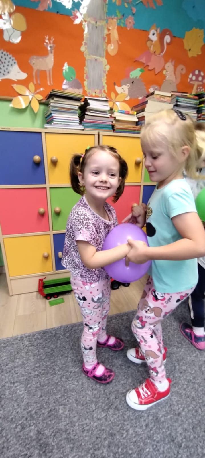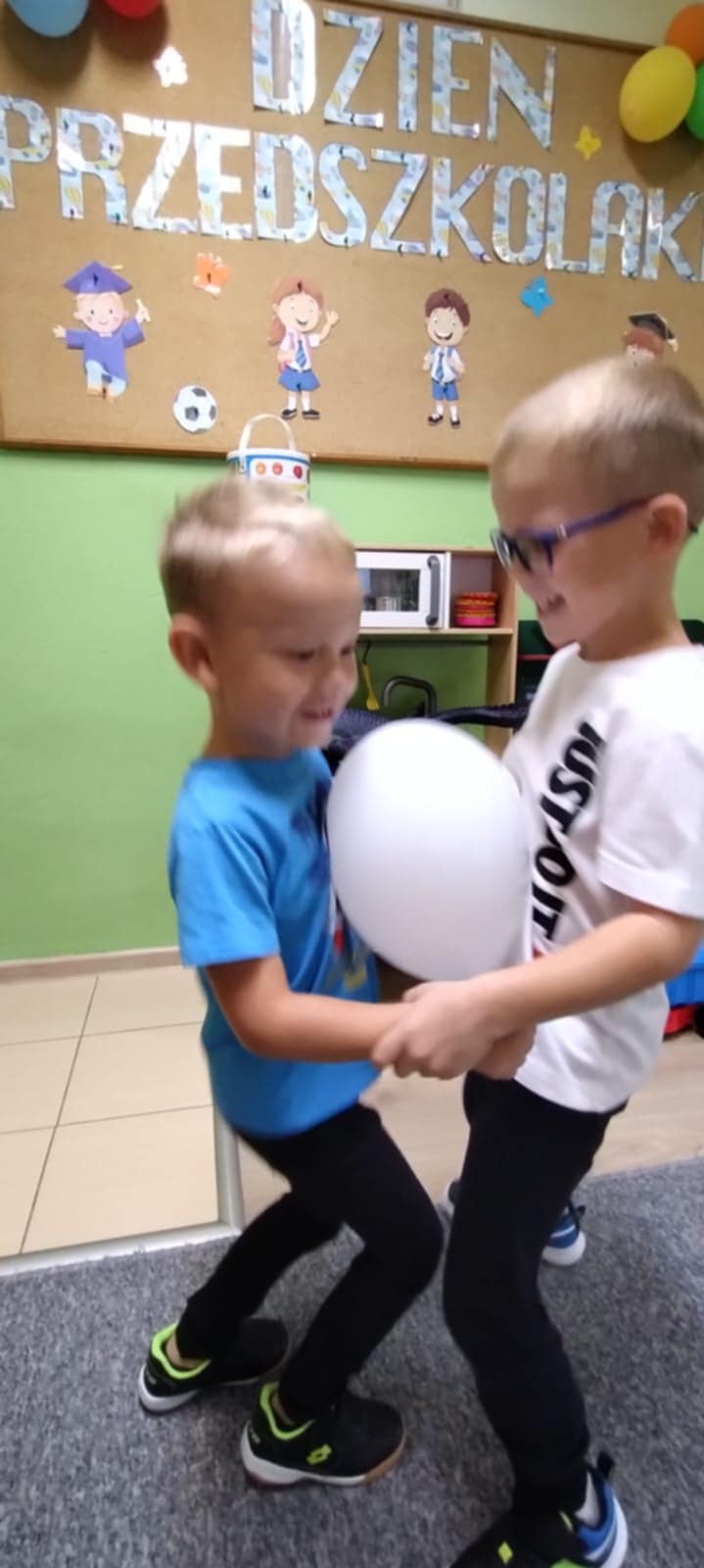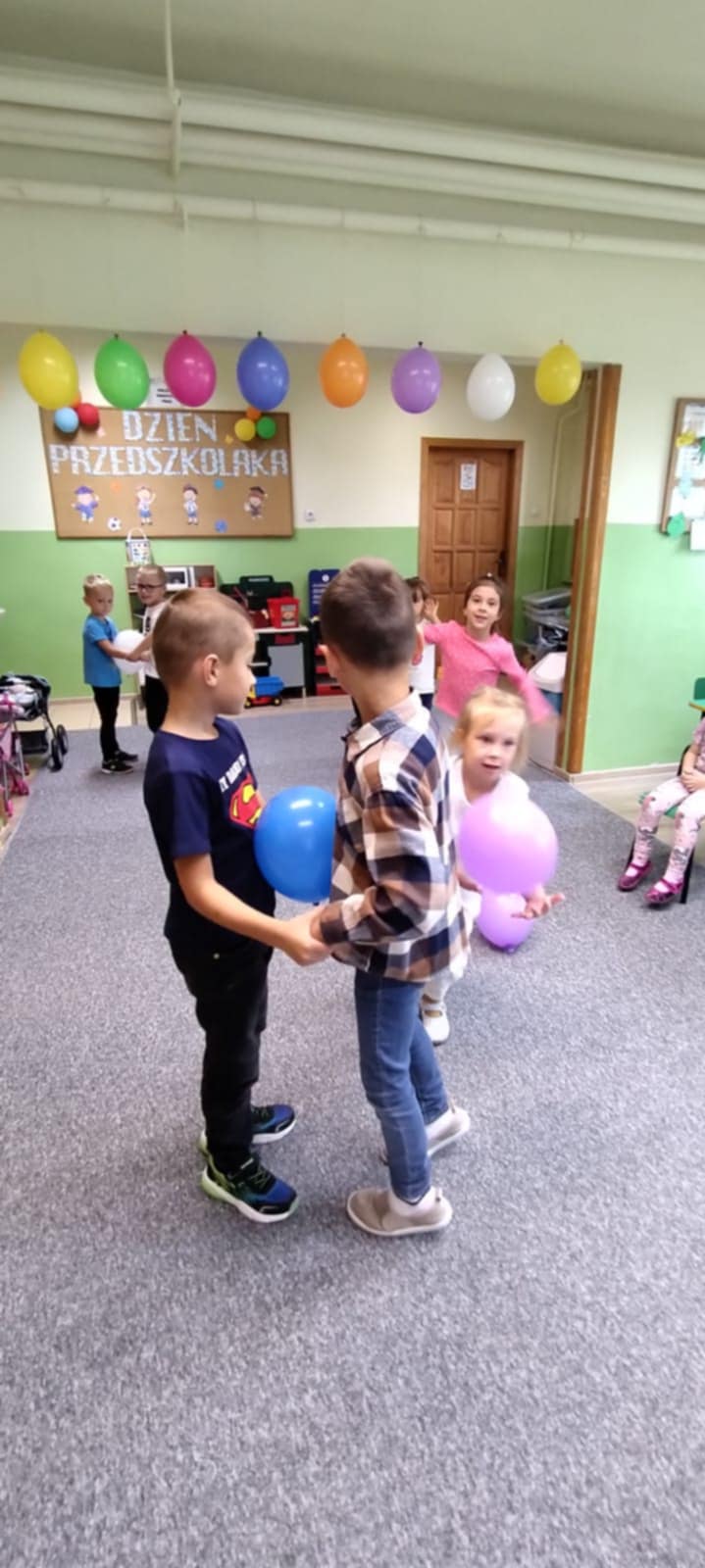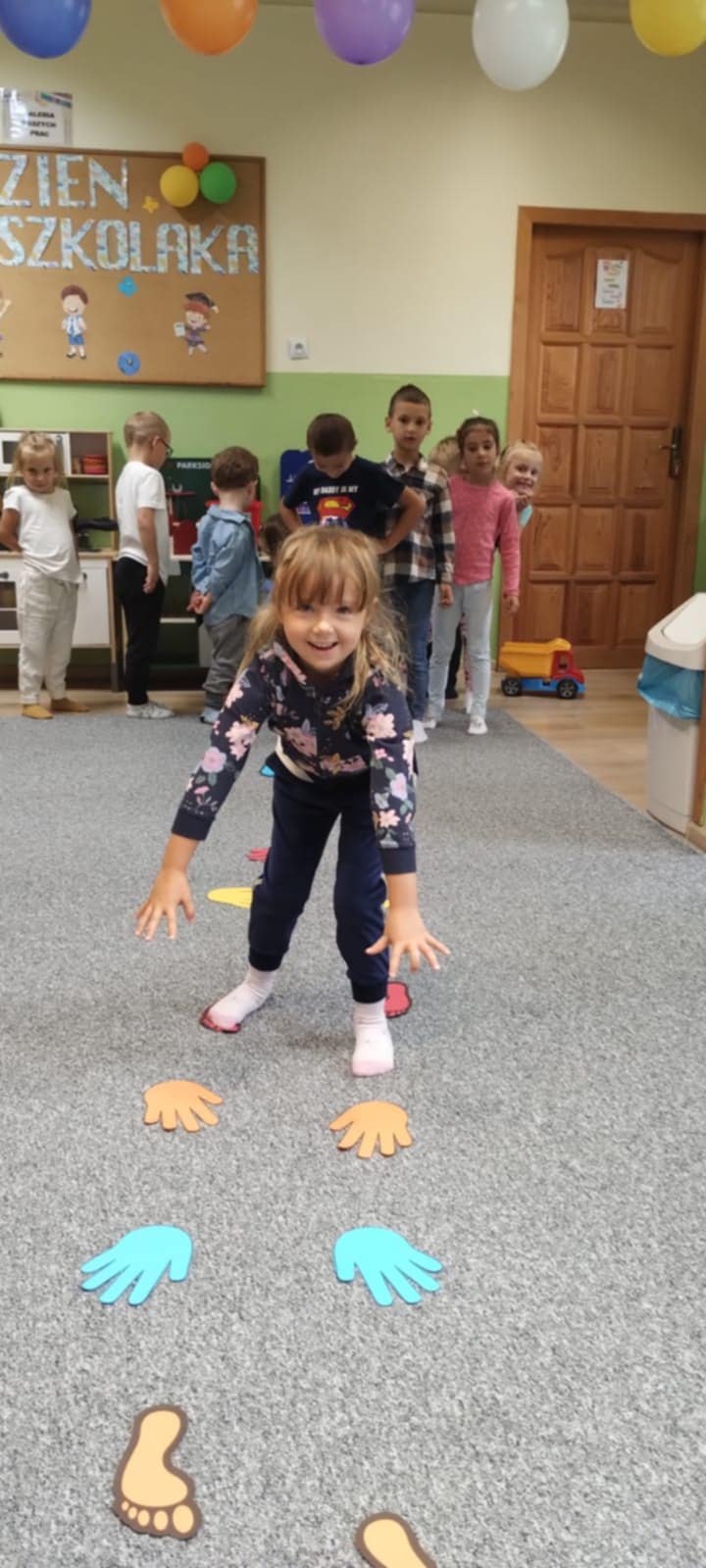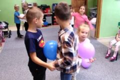 Przedszkolaki brały udział w zabawach muzyczno-ruchowych, takich jak „Idź po śladach” czy „Maszynista Zuch”. Dużo emocji wzbudziła również zabawa w szukanie literek, z których dzieci ułożyły hasło „Dzień Przedszkolaka”. Ogromną radość sprawiło im malowanie oraz taniec z kolorowymi balonami.