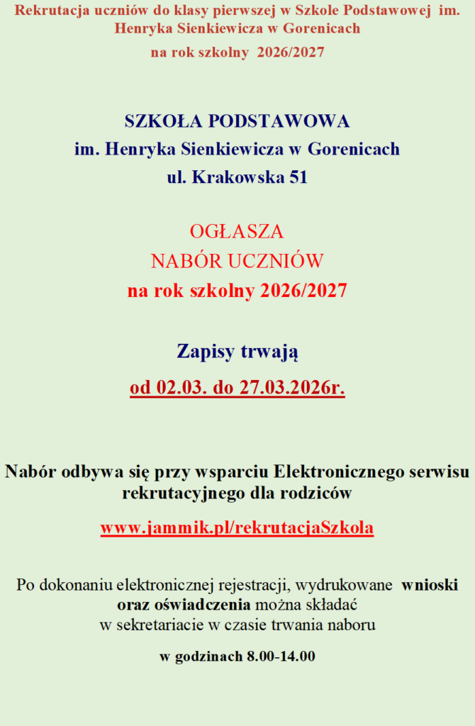 Rekrutacja do klasy I na rok szkolny 2026/2027 Opublikowano w dniu 25 lutego 2026 szczegółowe informacje i dokumenty do pobrania są w zakładce: „Dla uczniów i Rodziców”- rekrutacja Dla Uczniów i Rodziców