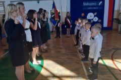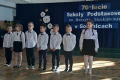 Uczniowie klasy I rozpoczęli uroczystość pięknym polonezem wspólnie z uczniami klasy VIII. Zaśpiewali wzruszającą piosenkę „ Kto Ty jesteś- Polak Mały”, zaprezentowali poruszający układ do muzyki A. Kurylewicza „Polskie drogi”, w wesoły sposób przedstawili siebie w piosence ”Nasza klasa jest wesoła”.