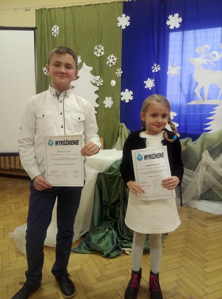 Uczniowie naszej szkoły, Amelia Janczyk i Bartosz Żaba otrzymali wyróżnienie w I edycji Konkursu informatyczno – ekologicznego pod hasłem „woda to źródło życia, gdyż jesteśmy tym co pijemy i jemy, jemy to co wyrośnie, wyrośnie takie jak gleba, gleba taka jak o nią dbamy i co do niej wyrzucamy”. Organizatorami konkursu było Przedsiębiorstwo Wodociągów i Kanalizacji w Olkuszu wraz ze Szkołą Podstawową Nr 6 im. F. Chopina w Olkuszu. Gratulujemy!