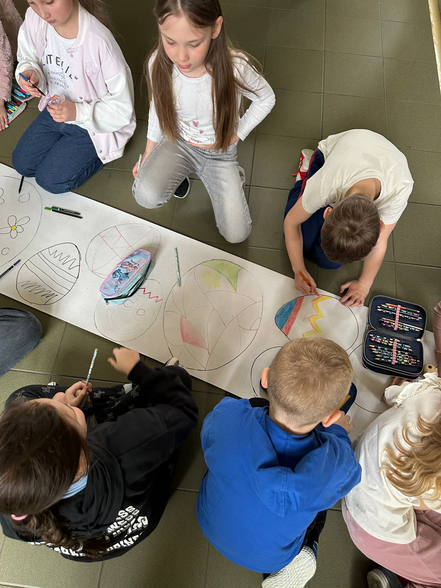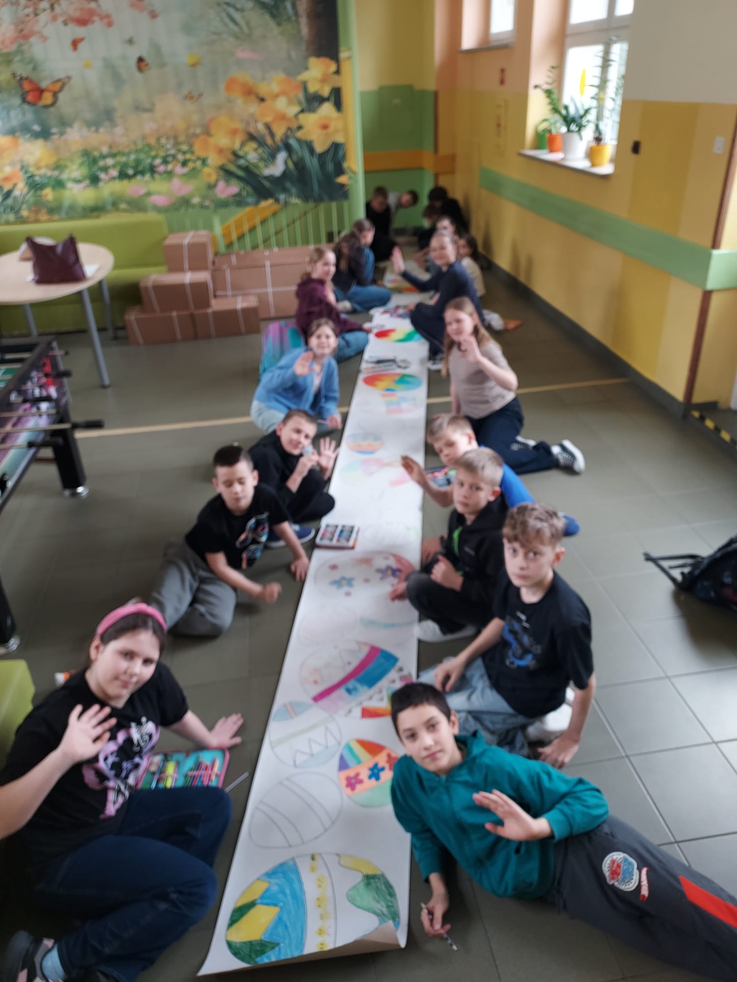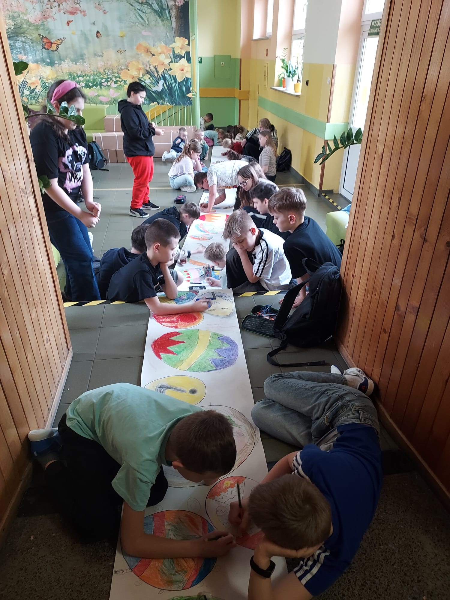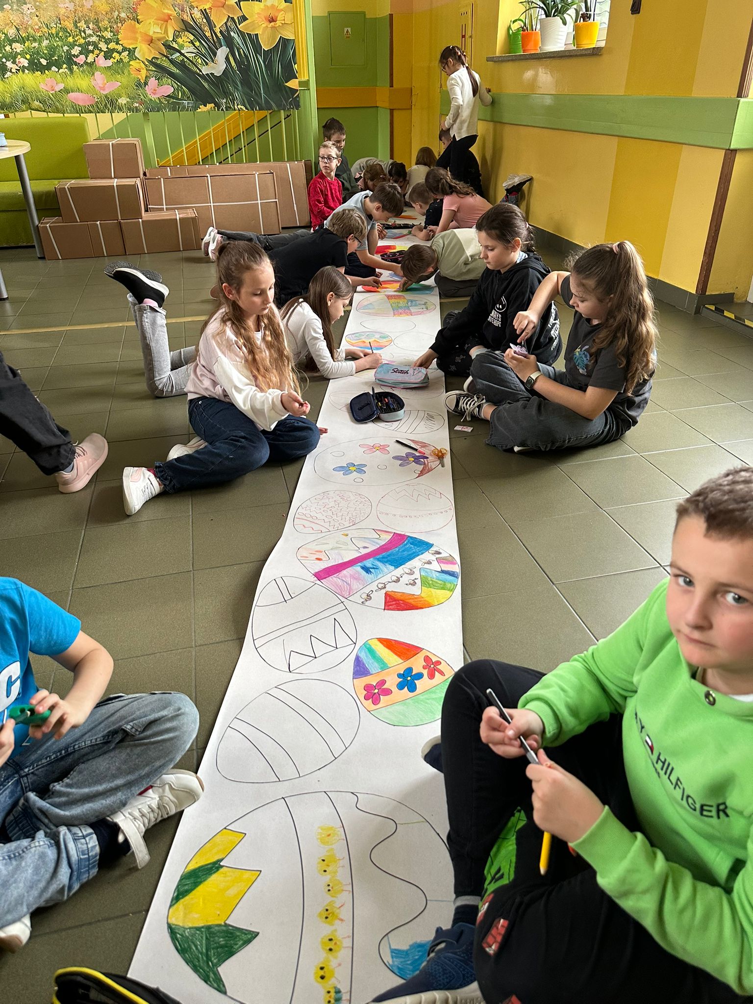 Dzisiejszy dzień w szkole okazał się świętem wiosennych i letnich kolorów. Odbyła się bowiem przedświąteczna, integracyjna akcja plastyczna pod hasłem: „Wiosenna pisanka”, w której wzięli udział wszyscy uczniowie naszej szkoły. Przy pomocy kredek dali upust własnej wyobraźni. Rozmów, współpracującej wymiany zdań i pomysłów nie było końca. Powstała masa wielobarwnych pisanek, na ogromnym kartonie, który zawisł jako element dekoracji apelu świątecznego.