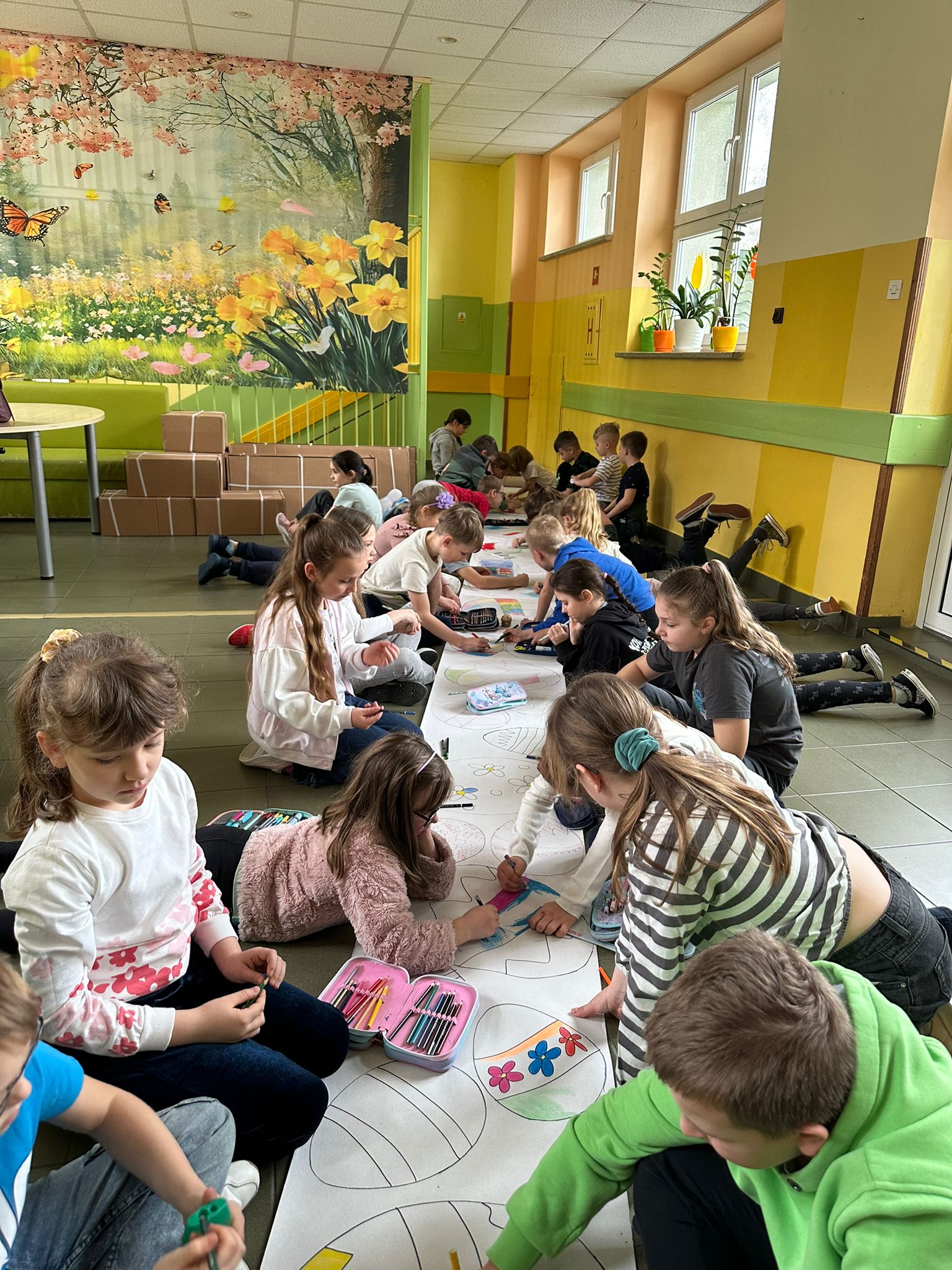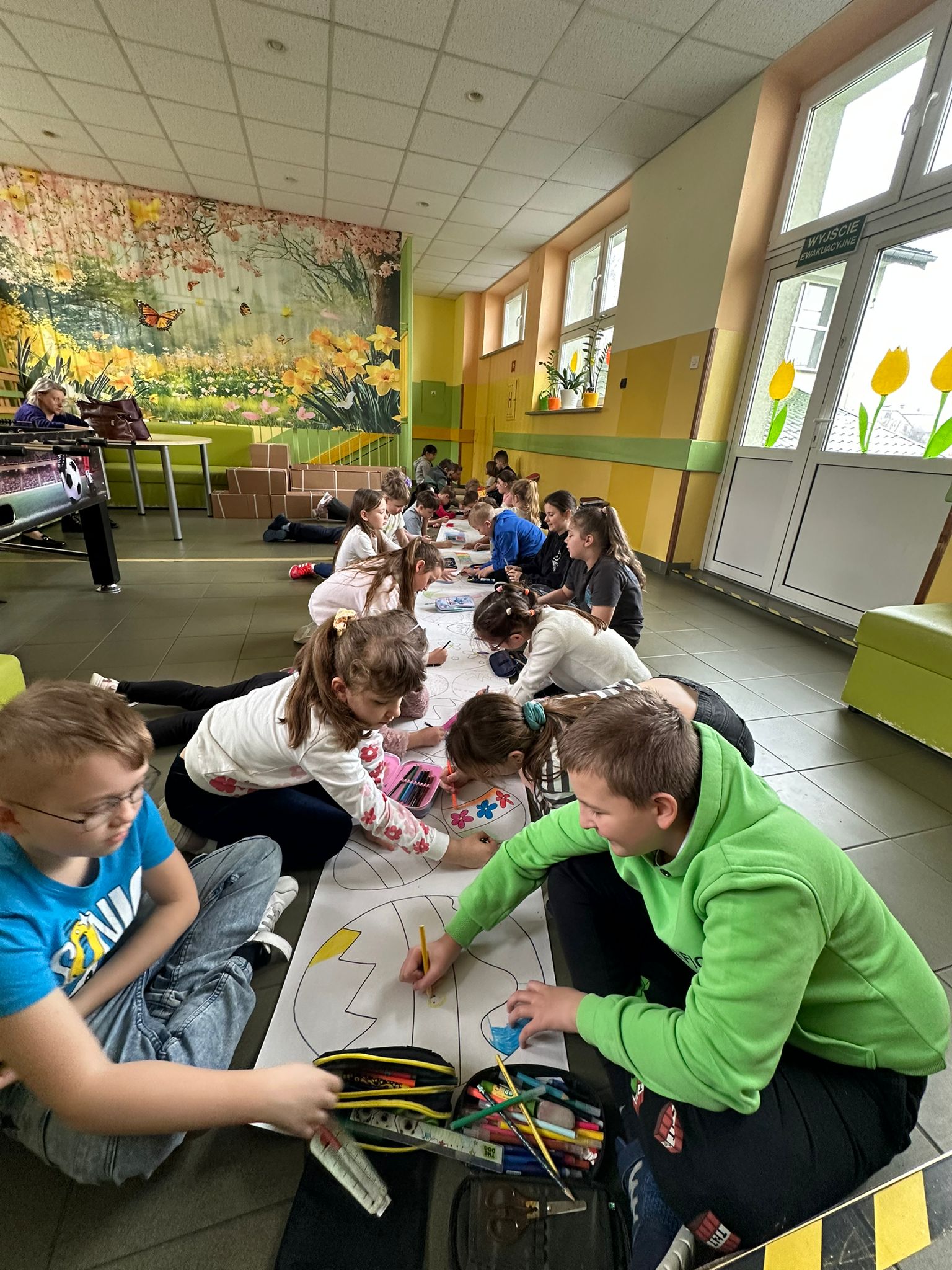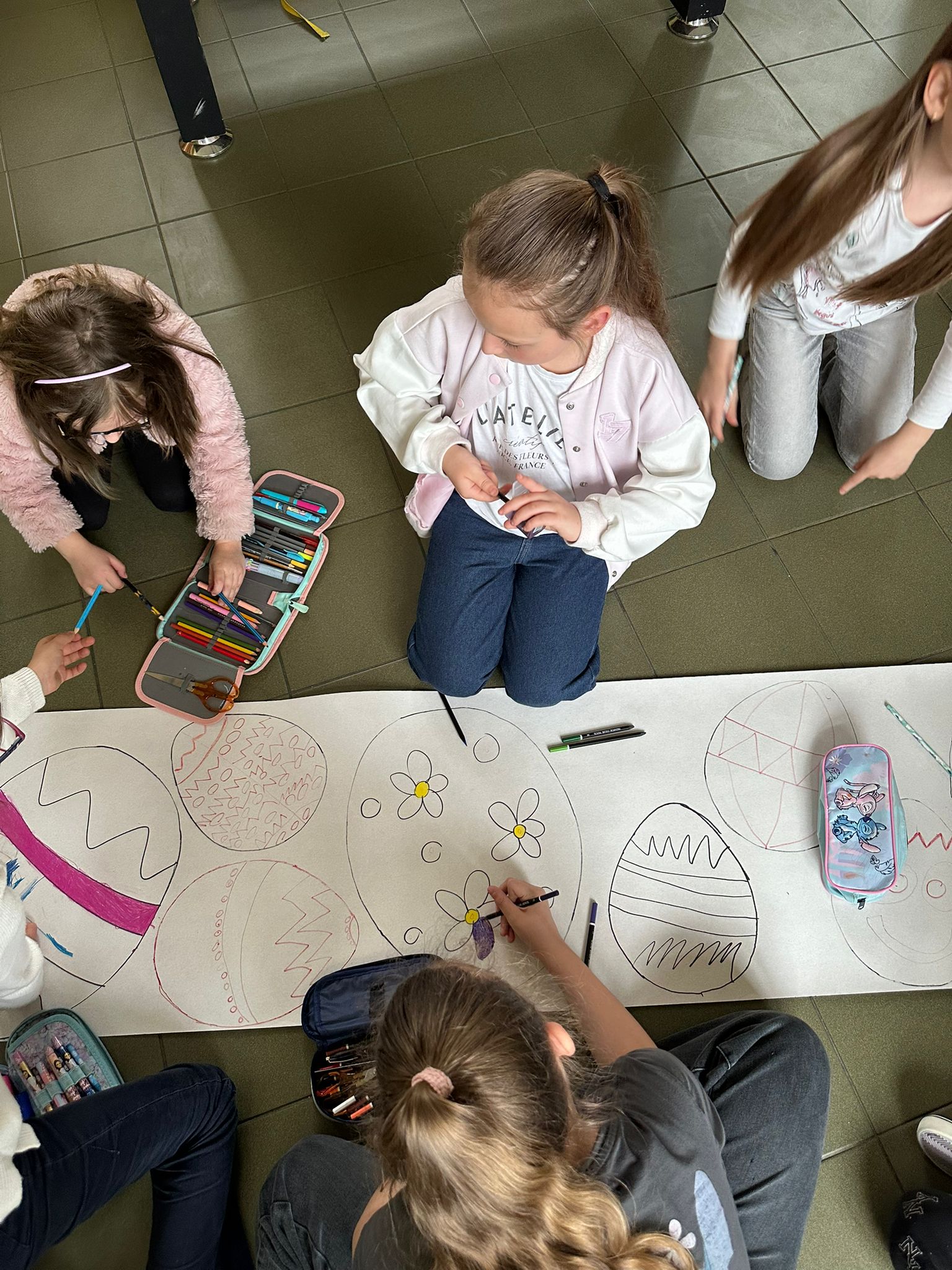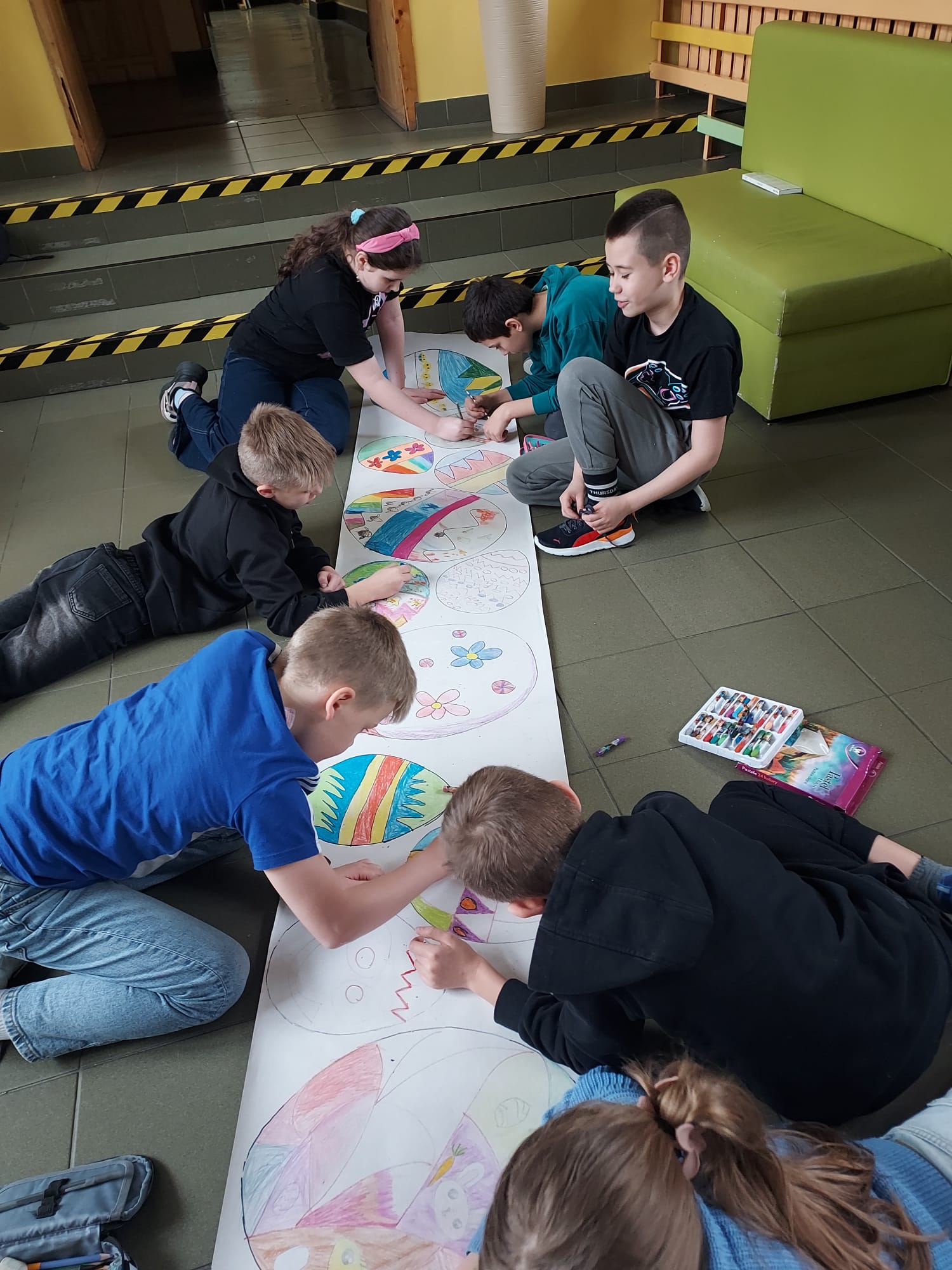 Dzisiejszy dzień w szkole okazał się świętem wiosennych i letnich kolorów. Odbyła się bowiem przedświąteczna, integracyjna akcja plastyczna pod hasłem: „Wiosenna pisanka”, w której wzięli udział wszyscy uczniowie naszej szkoły. Przy pomocy kredek dali upust własnej wyobraźni. Rozmów, współpracującej wymiany zdań i pomysłów nie było końca. Powstała masa wielobarwnych pisanek, na ogromnym kartonie, który zawisł jako element dekoracji apelu świątecznego.