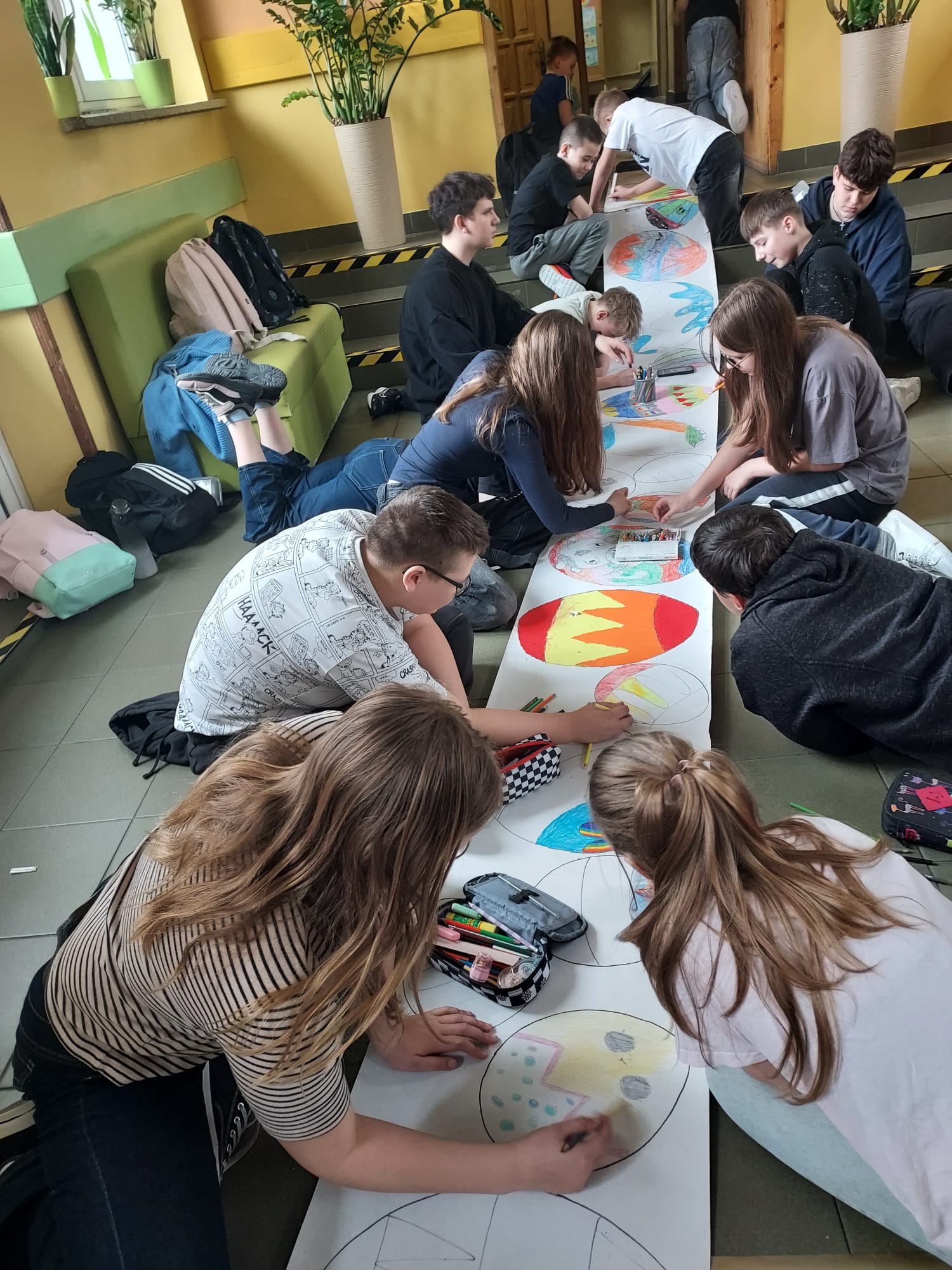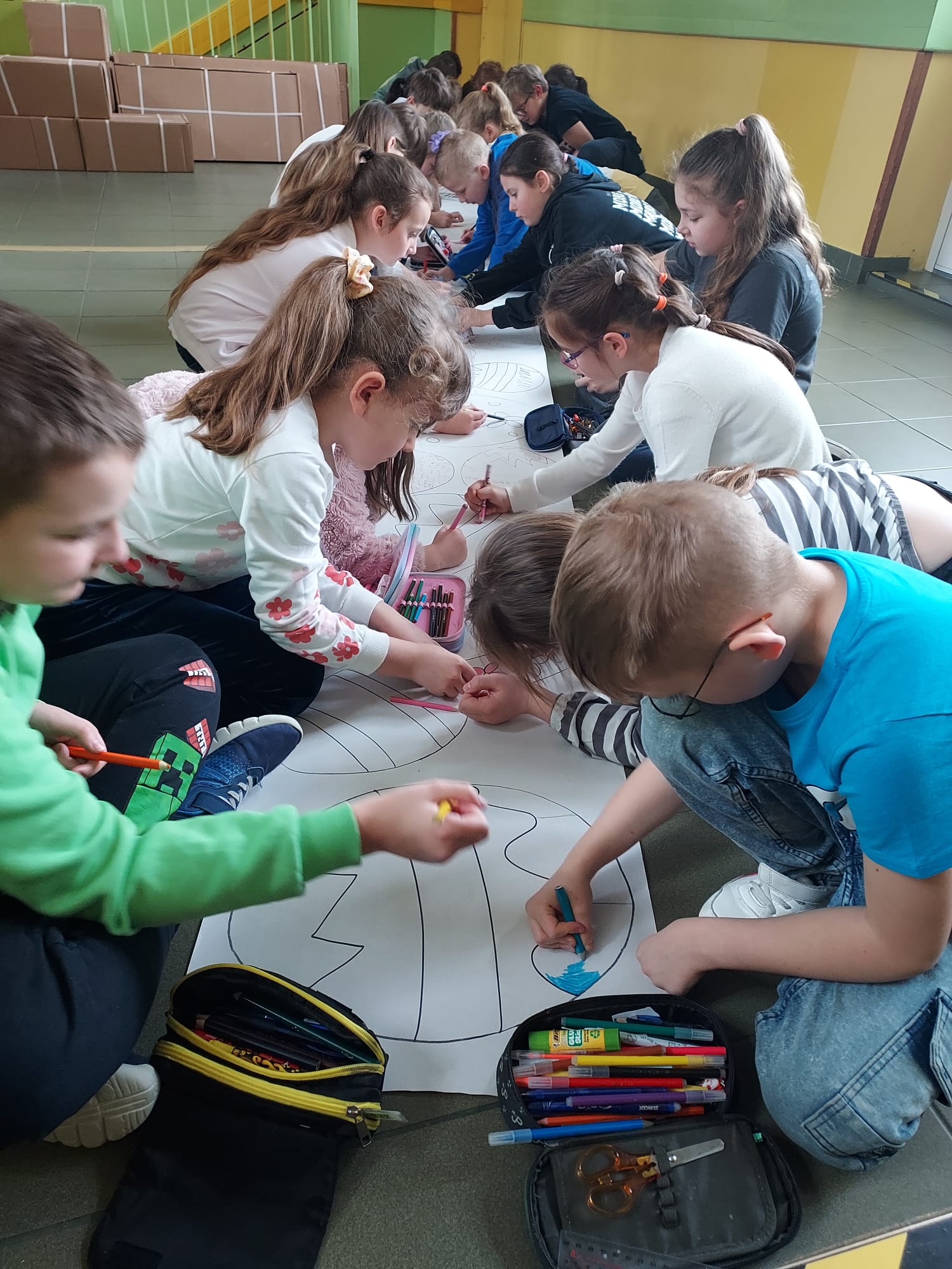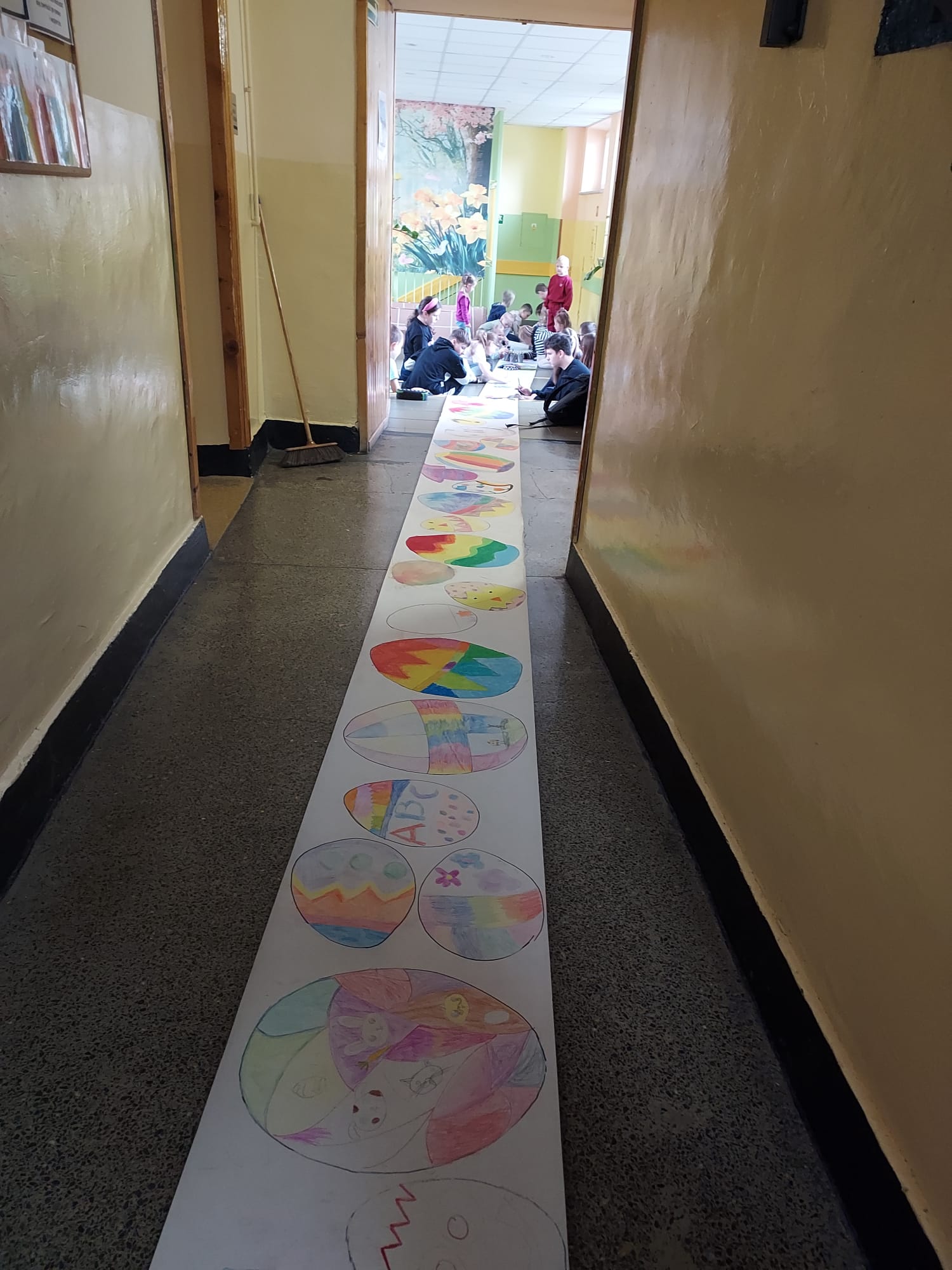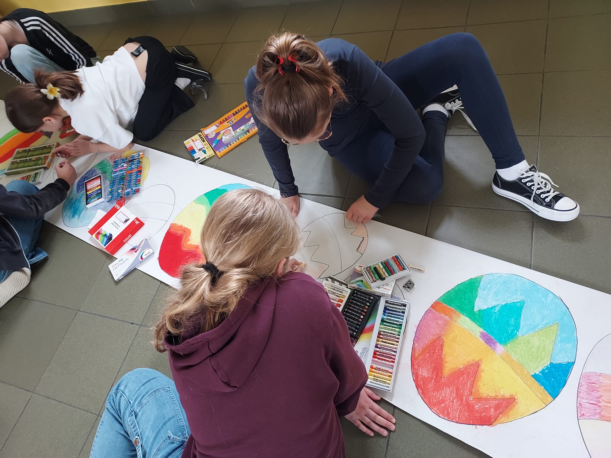 Dzisiejszy dzień w szkole okazał się świętem wiosennych i letnich kolorów. Odbyła się bowiem przedświąteczna, integracyjna akcja plastyczna pod hasłem: „Wiosenna pisanka”, w której wzięli udział wszyscy uczniowie naszej szkoły. Przy pomocy kredek dali upust własnej wyobraźni. Rozmów, współpracującej wymiany zdań i pomysłów nie było końca. Powstała masa wielobarwnych pisanek, na ogromnym kartonie, który zawisł jako element dekoracji apelu świątecznego.