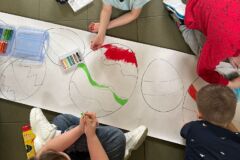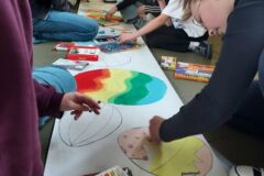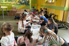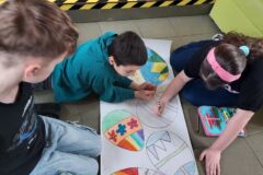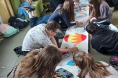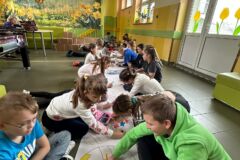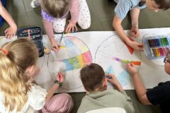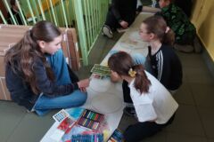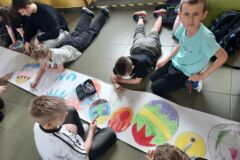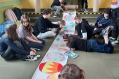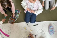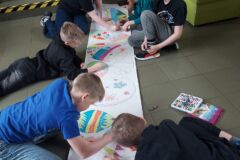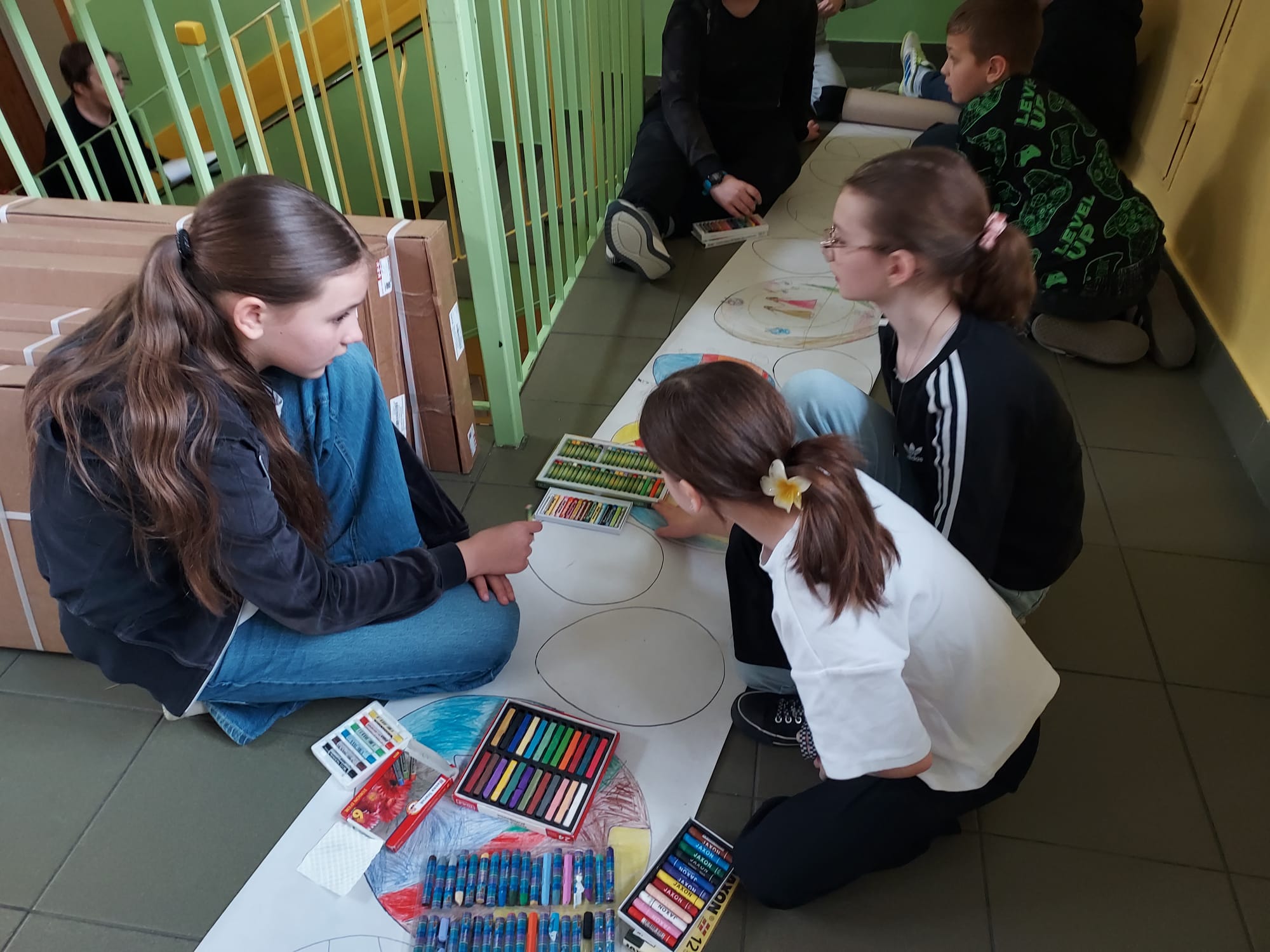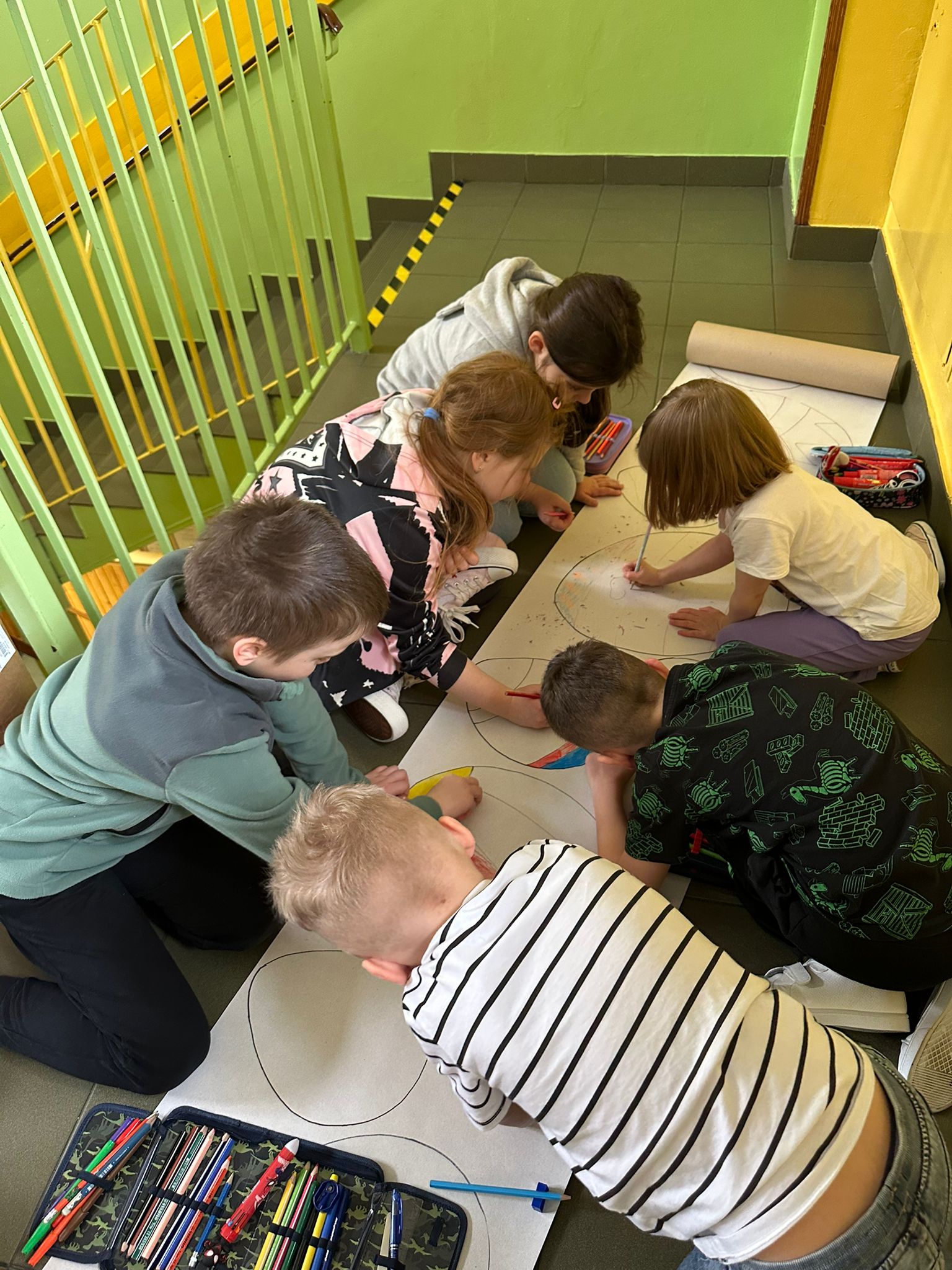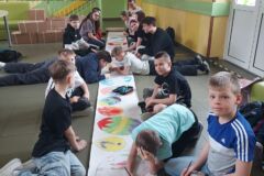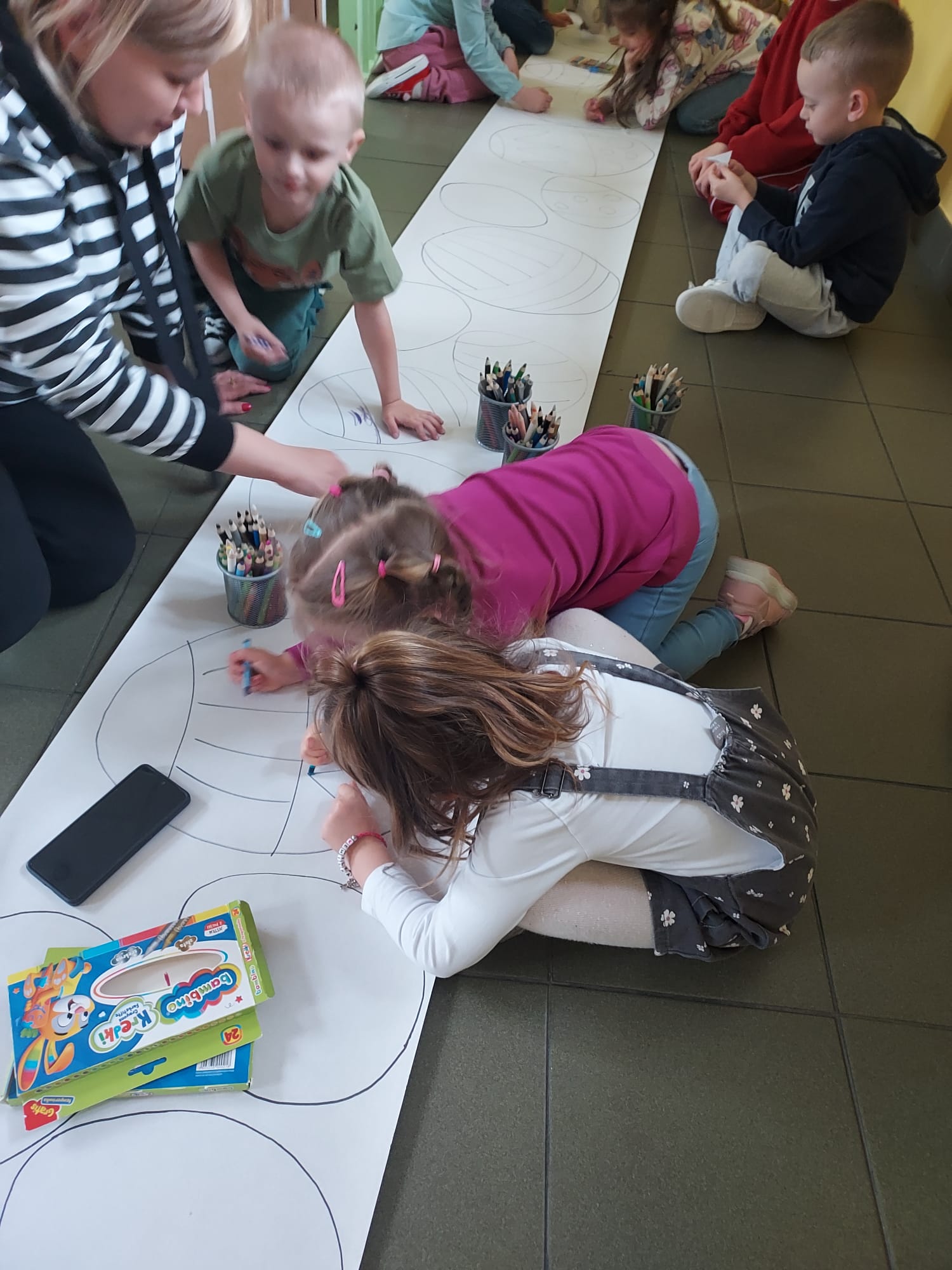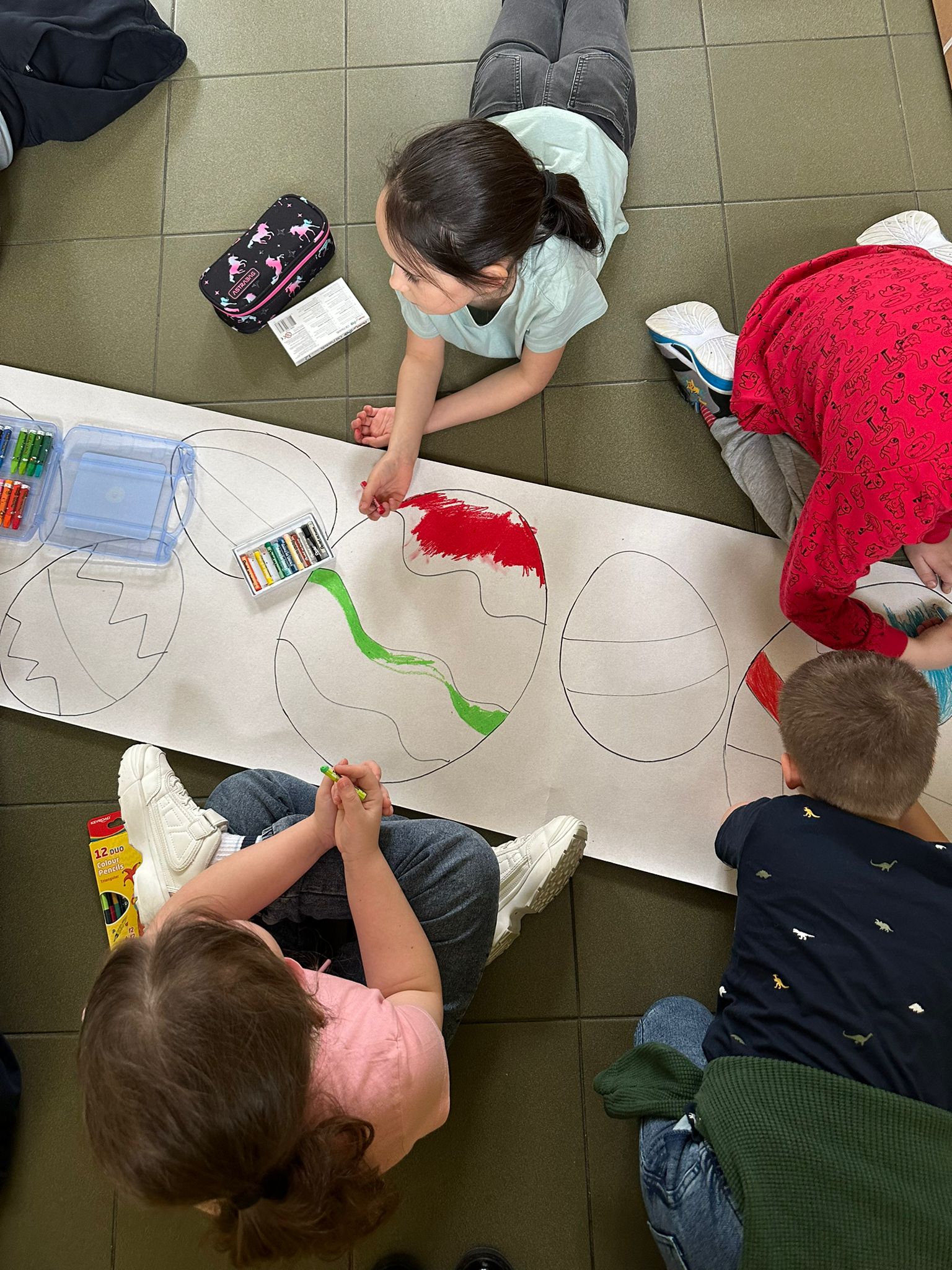 Dzisiejszy dzień w szkole okazał się świętem wiosennych i letnich kolorów. Odbyła się bowiem przedświąteczna, integracyjna akcja plastyczna pod hasłem: „Wiosenna pisanka”, w której wzięli udział wszyscy uczniowie naszej szkoły. Przy pomocy kredek dali upust własnej wyobraźni. Rozmów, współpracującej wymiany zdań i pomysłów nie było końca. Powstała masa wielobarwnych pisanek, na ogromnym kartonie, który zawisł jako element dekoracji apelu świątecznego.