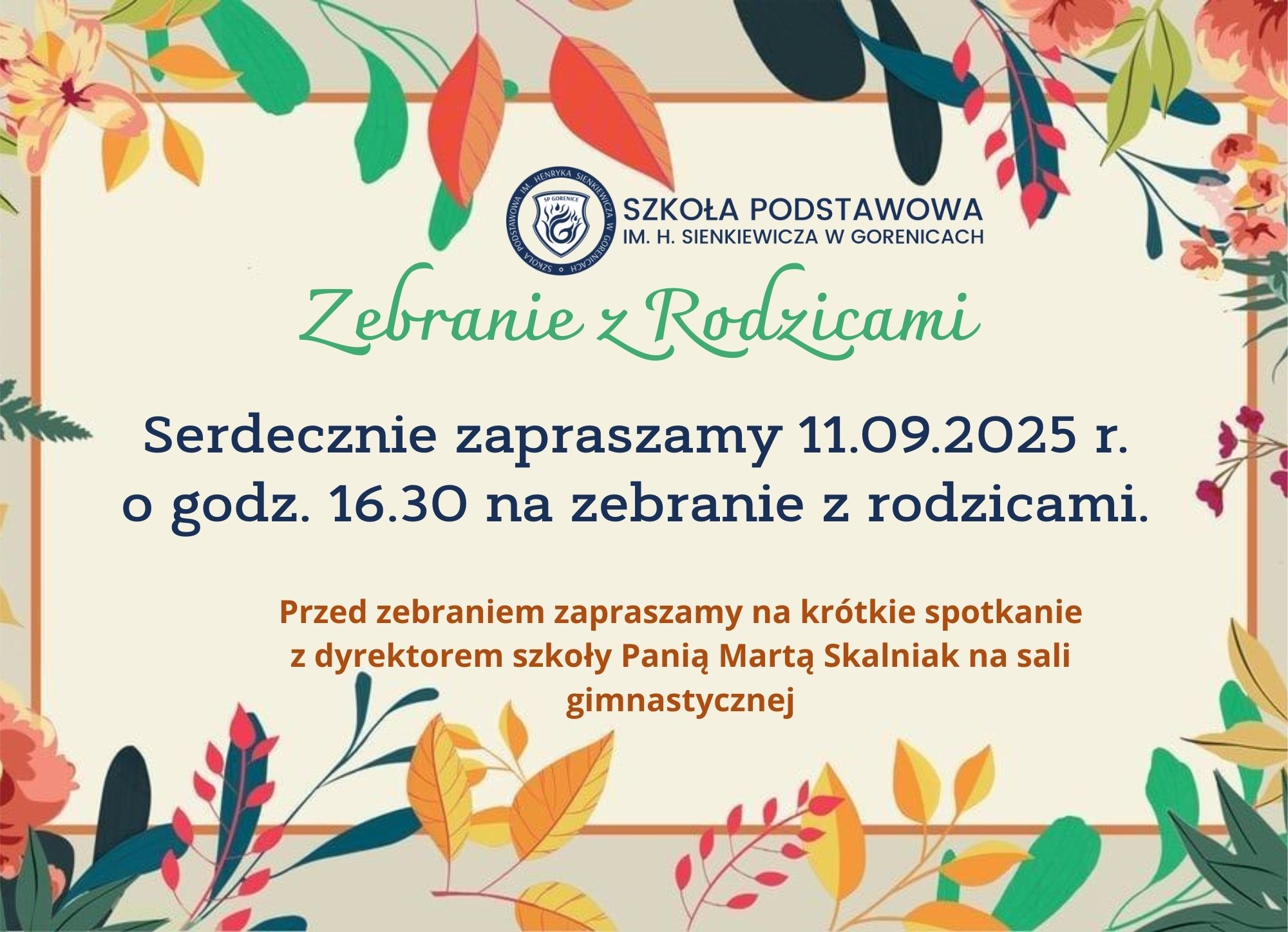 Serdecznie zapraszamy wszystkich rodziców na pierwsze w tym roku zebranie, które odbędzie się 11.09.2025 o godz. 16.30
