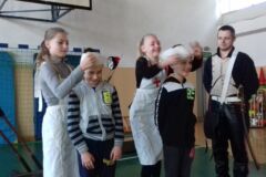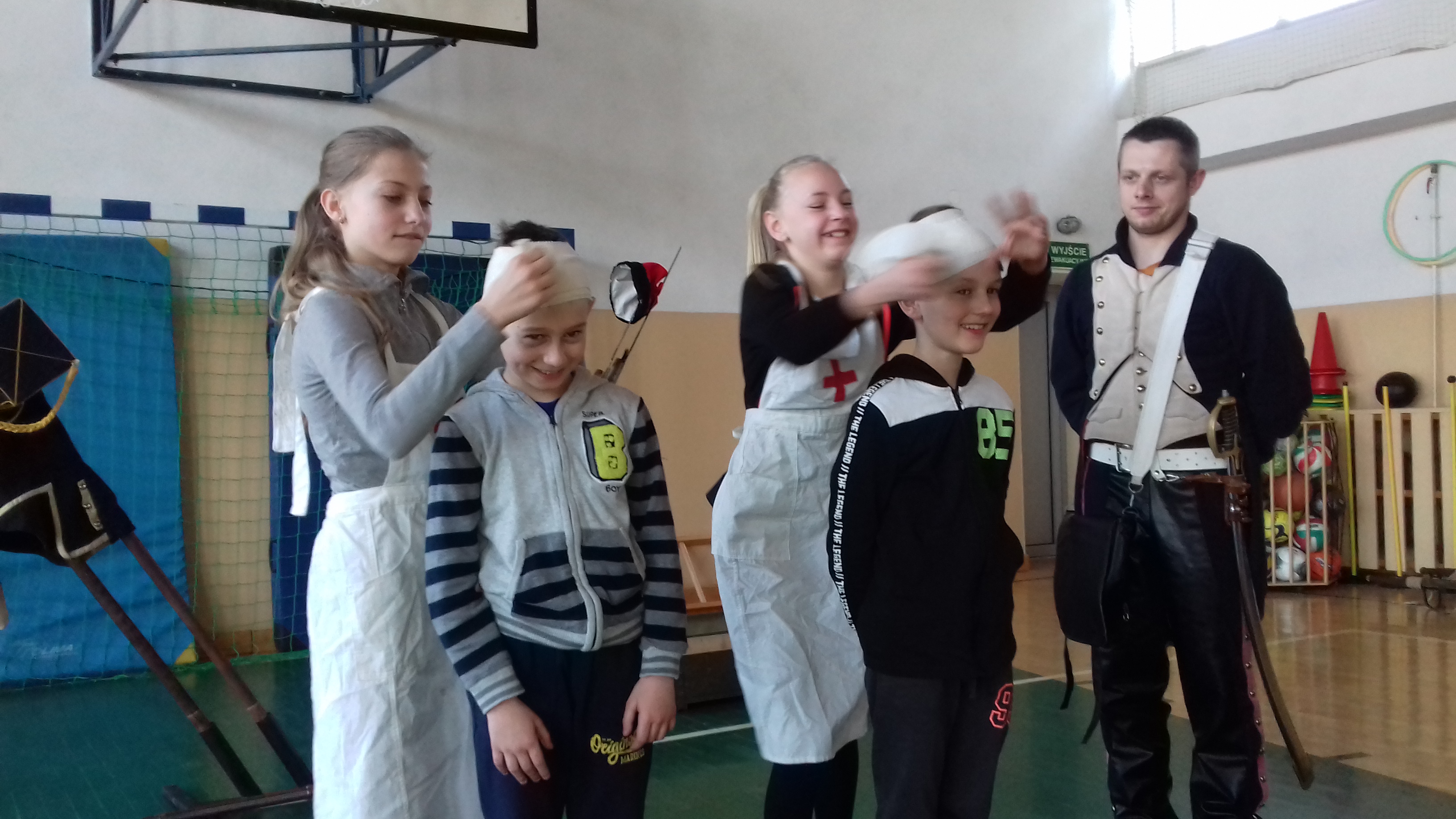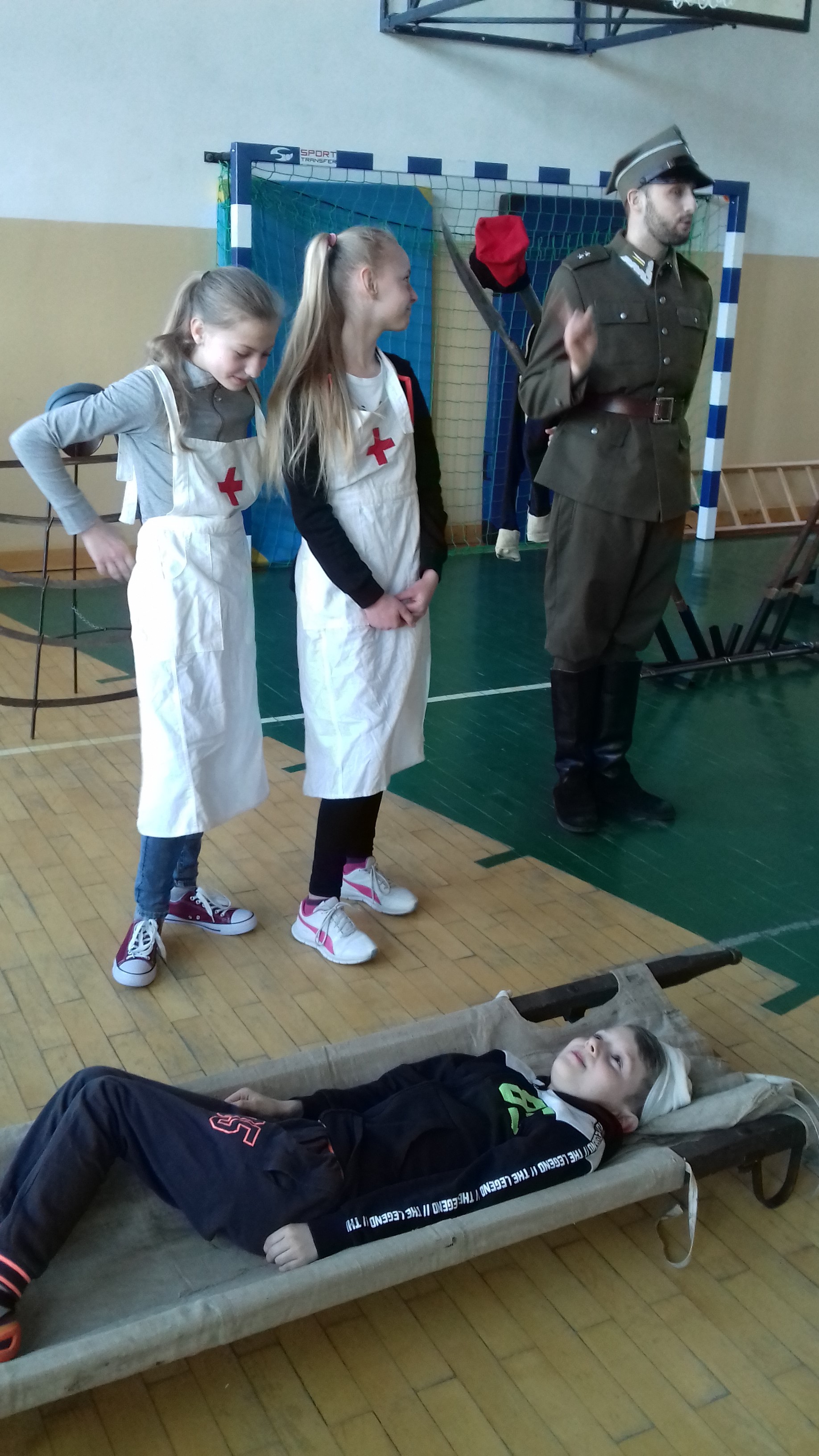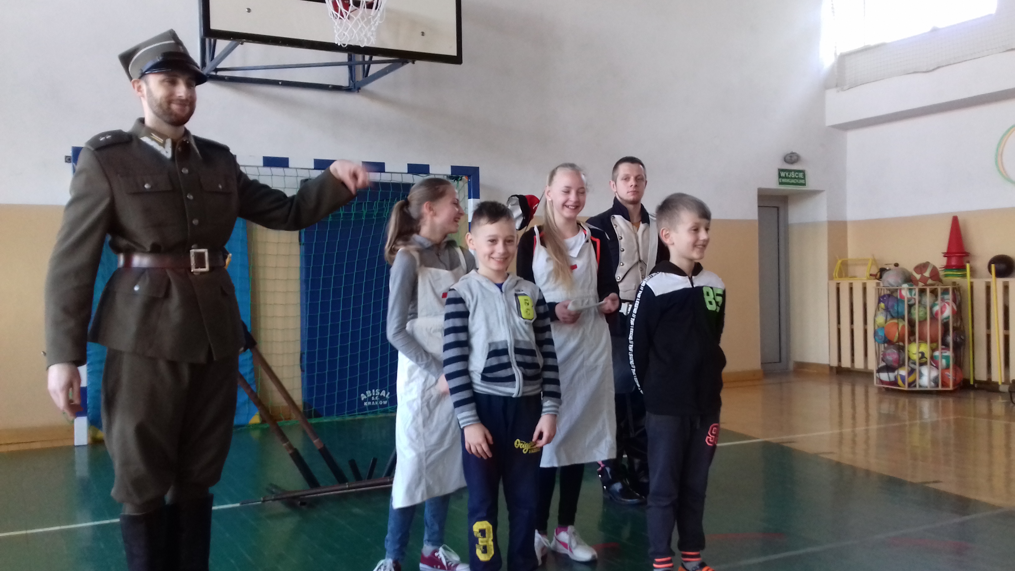 Grupa artystyczna „Rekonstrukto” zaprezentowała pokaz historyczny pt. „Ku niepodległej” .Nawiązywał do bohaterskiej walki naszych przodków o wolność ojczyzny i honor narodu w czasach zaborów i I Wojny Światowej. Goście z Dębina przedstawili naszym uczniom stroje żołnierskie z czasów powstań narodowowyzwoleńczych (szwoleżera, kosyniera, oficera I brygady Legionów Polskich), kolekcję replik broni używanych przez powstańców i w czasie I Wojny Światowej, ekwipunek żołnierski. Przeprowadzili też musztrę wojskową i lekcję posługiwania się szablą. Prowadzący naświetlili rolę marszałka Józefa Piłsudskiego oraz Legionów Polskich w trudnych czasach walki o niepodległość.